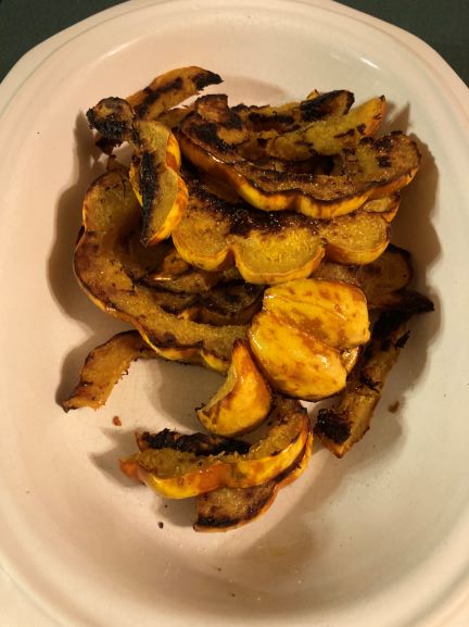 Nowadays, hubby is the one doing a lot of the dinner cooking since I work later than him. He had already successfully turned me on to spaghetti squash and now it’s a go to side dish (We don’t like it with red sauce btw). Having stronger hand strength than me he has turned many a butternut squash into delicious soup. So when he turned to me and said “shall we try the delicato cross?”, I couldn’t say no. And boy am I glad I pivoted on this one! Hubby says he followed a delicato fries recipe and it worked out great with the cross. He slices it into thin fry type shapes, roasts it for 25 minutes at 400 degrees. No seasonings just a little olive and YUM! Like the perfect fry, they are crunchy on the outside from the skin and creamy on the inside. The next week at the market we got 2 squashes and ate them both!