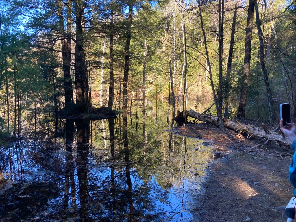 We were almost back to the trailhead after a fabulous hike. The weather was picture perfect: not too hot or cold and a cloudless blue sky. The conversations were thought provoking and everyone felt physically strong on the trail. We hiked Cat Mountain in Bolton Landing which has a fair amount of elevation. We did the red trail up and the blue trail down. Steep on the way up and relatively easier on the way down. Fallen leaves can make fall hiking treacherous but nary a stumble happened in our group. I was chatting with one of the 2 people in our group who had hiked this mountain before when he looked ahead and said “Oh no.” I couldn’t see what he was talking about at first. The sunlight reflecting on the water made it difficult to see the huge pond that covered the trail ahead! We admired the new pond before finding a foot path off to our right that we could take around the pond. We only had to ford a rock strewn creek to do it!